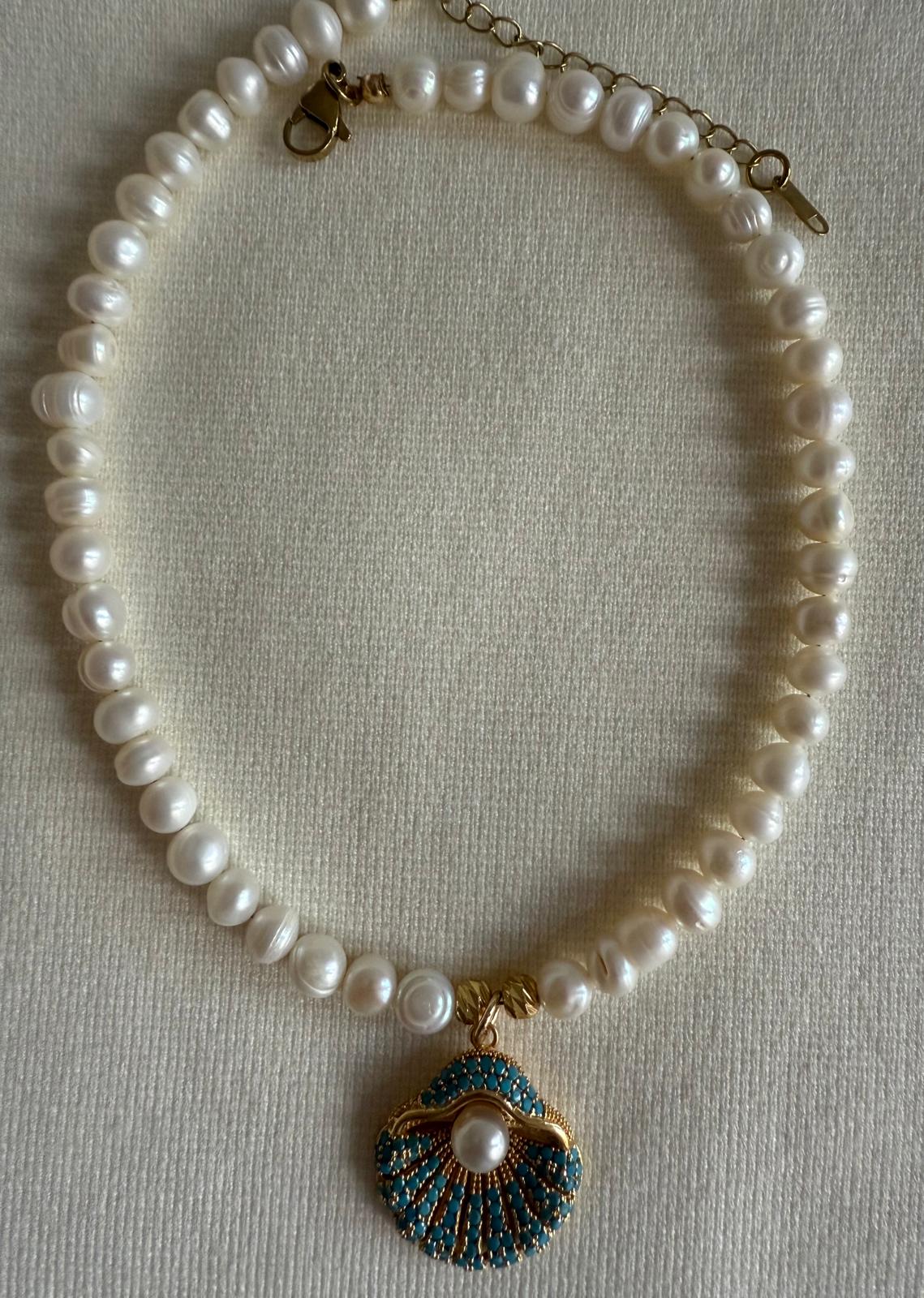 Embrace the allure of the ocean with this exquisite pearl necklace. Featuring lustrous pearls and a captivating seashell pendant adorned with vibrant turquoise and a central pearl, it’s a timeless treasure. Handmade crafted with care