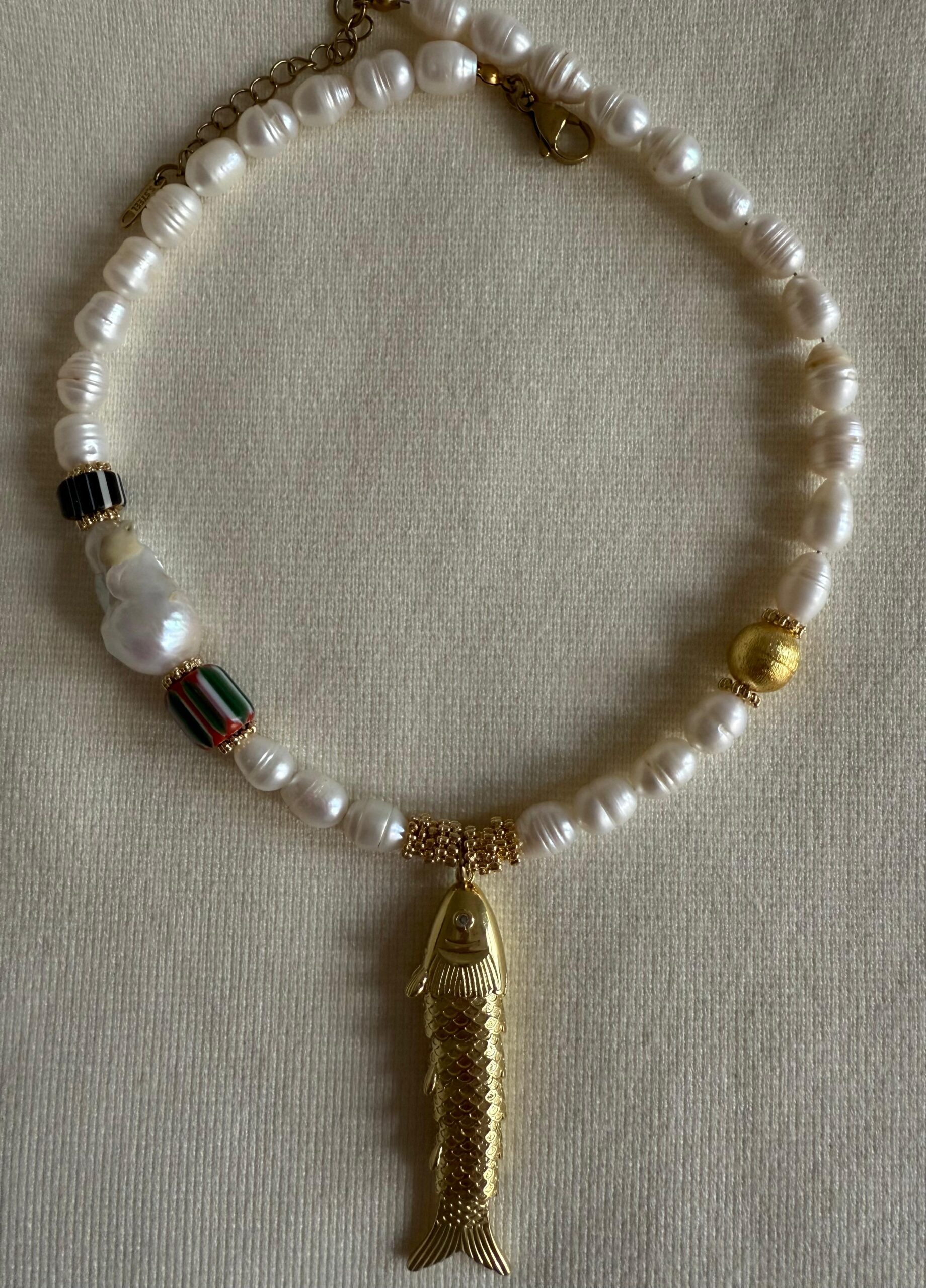 timeless piece handcrafted with lustrous real pearls, accented by a striking copper fish charm. This necklace embodies classic elegance with a touch of the sea.